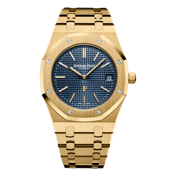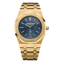 18-carat yellow gold case, glareproofed sapphire crystal and caseback. Blue dial with “Petite Tapisserie” pattern, yellow gold applied hour-markers and Royal Oak hands with luminescent coating. 18-carat yellow gold bracelet with AP folding clasp.