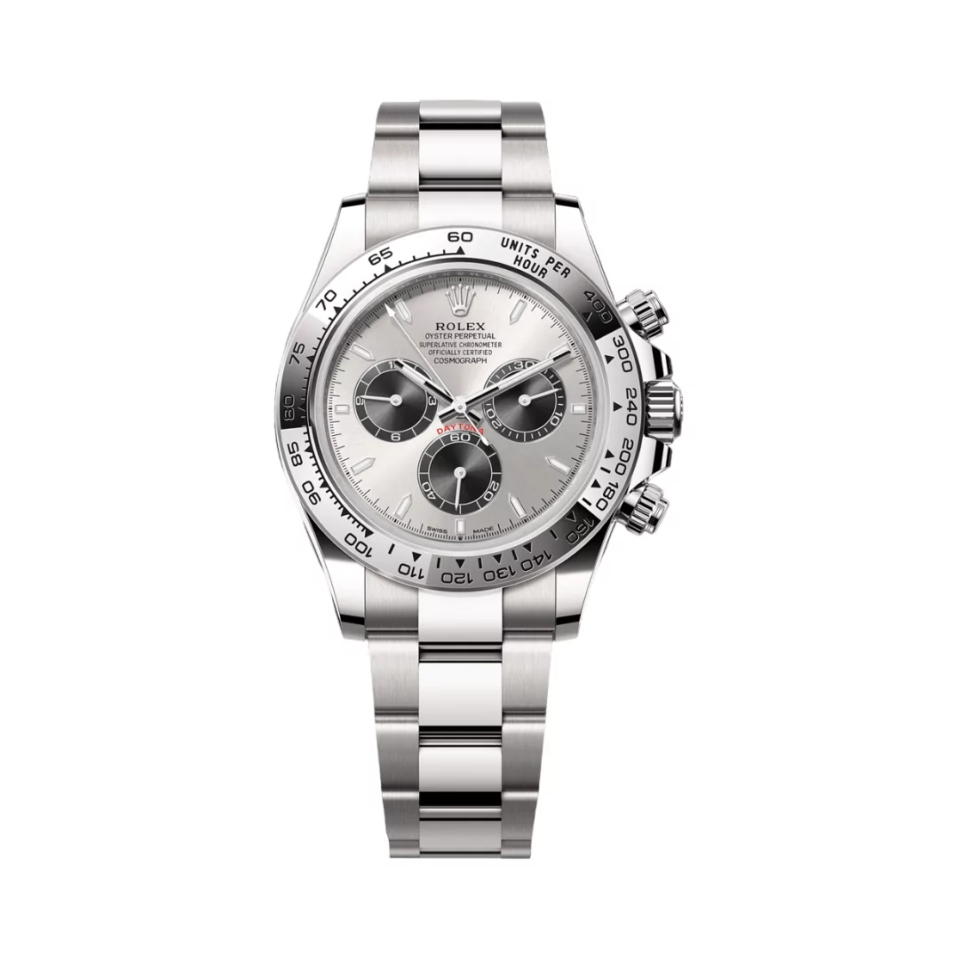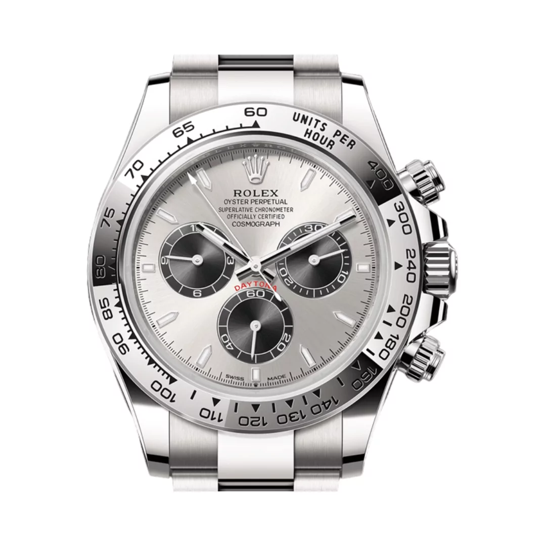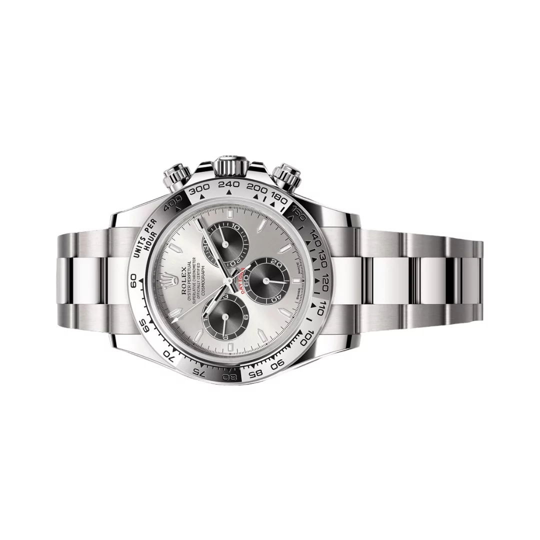Crafted from durable and beautiful white gold, the case and bracelet of the Rolex Cosmograph Daytona are designed to stand out while providing long-lasting durability. The watch case measures 40 mm, a perfect size for comfortable wear on the wrist. This white gold bracelet not only adds to the luxurious look but also enhances comfort, making it ideal for daily wear or special occasions.