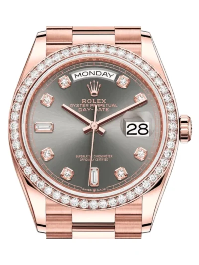 Rolex Datejust 116199 SANR features 36mm 18K white gold case, bezel set with 60 baguette black sapphires, bezel edge and endpieces set with diamonds, black and diamond paved dial, diamond hour markers, and black rubber and galuchat strap set with 10 diamonds.