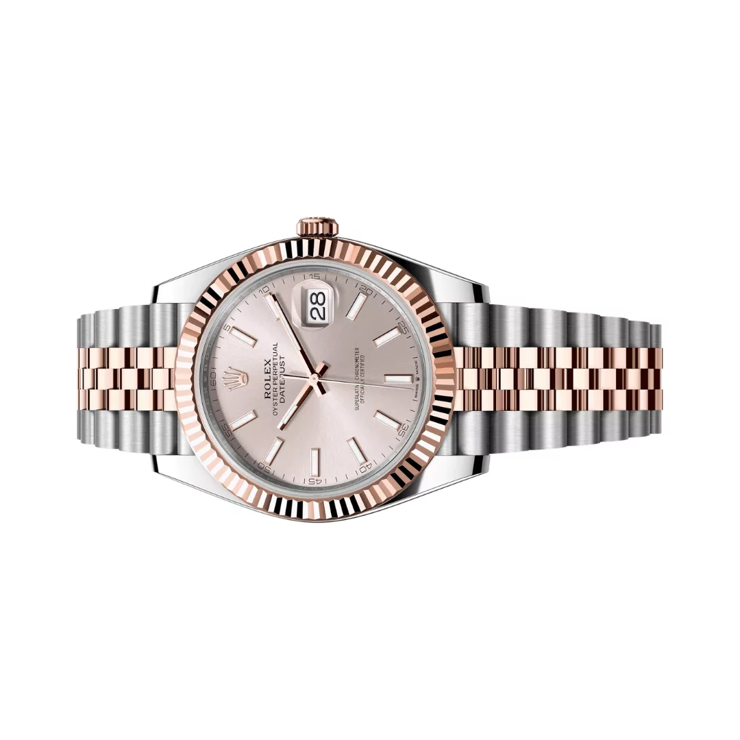 The Rolex Datejust m126331-0010 is a luxurious 41mm timepiece crafted in Rose Rolesor, combining 18K Everose gold and 904L stainless steel. Its elegant sundust dial with index hour markers exudes sophistication, while the fluted bezel adds a signature Rolex touch. Designed for both formal and casual occasions, this watch perfectly balances style and performance.